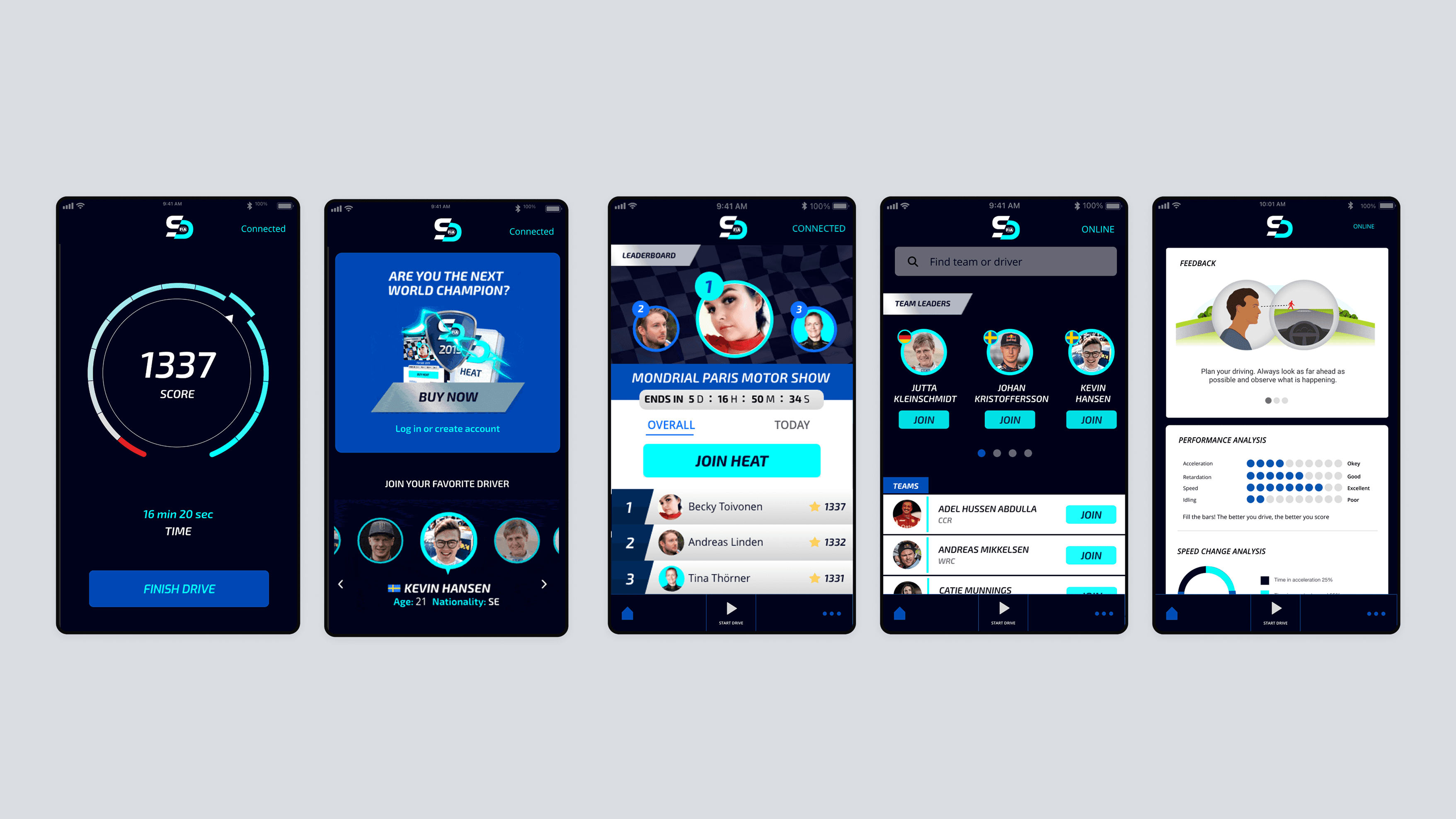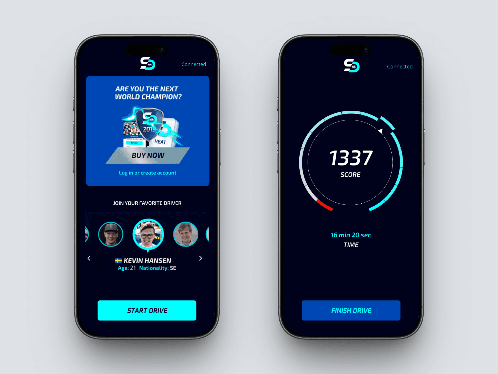 I approached the project by balancing rapid delivery with responsible design decisions in an early-stage product context. I led the UX, UI, and visual direction of a legacy app makeover, shifting the experience toward a more sport-driven, performance-focused product aligned with FIA’s brand, while continuously shipping client-ready prototypes to support business growth. The work prioritized road safety and low-distraction interactions, carefully limiting in-motion feedback and translating AI-driven risk and scoring data into clear, actionable signals rather than raw metrics. In parallel, I initiated a modular, white-label design approach to support fast client customization, and designed supporting visual assets — including event and marketing material for the FIA Smart Driving Challenge — to ensure consistent product communication across digital channels, demos, and public launch.