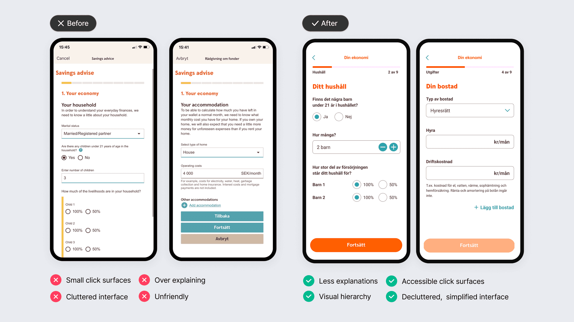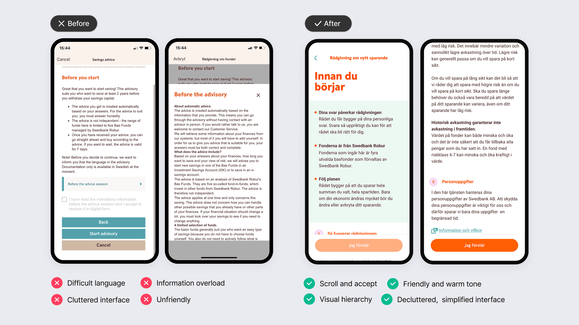 Swedbank wanted to offer customer-centric, legally compliant financial advisory in digital channels, but advisory had traditionally been handled offline. Early MVPs revealed a critical challenge: a ~95% drop-off on the very first screen of the advisory flow. Users struggled to understand the purpose, value, and effort required before even starting the advisory. Strict legal requirements and an existing design system limited how much the experience could be simplified, while still demanding high trust and cognitive effort upfront.